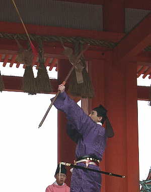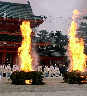 平安神宮で行われる節分行事です。 桃の弓で葦の矢を放ち、桃の枝で地を打ち鳴らし、 矛と盾を持った四つ目の方相氏が鬼を退散させます。