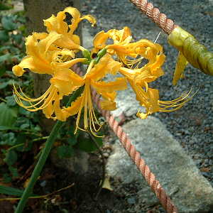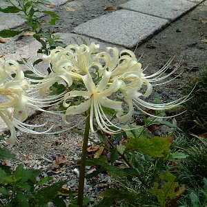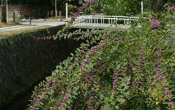 暑さも一段落、これからは秋が一気に進むのでしょうか。 秋の風情、哲学の道です。白い彼岸花に黄色の彼岸花??? 黄色だけれど、どう見ても彼岸花にみえます。 紫の実を付けているのは俗に云うムラサキシキブ。 でも、植物学的に正しくは「コムラサキ」、ムラサキシキブとは 実の付き方が異なります。 ※ 04/09/23 撮影