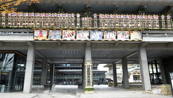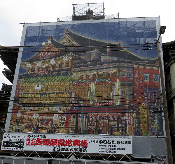 南座に掲げられた顔見世興行中の南座を描いた幕。 |