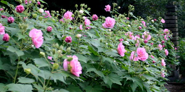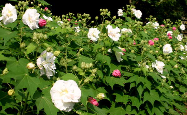 芙蓉(ふよう)はアオイ科の落葉低木。 咲き初めは白く、時を経ると共に 夕方には紅色に変わるものを酔芙蓉 (すいふよう)と云います。 一日花で紅色に丸まってしぼんでいる 花は昨日咲いた花です。 酔ったように赤く染めるところから 酔芙蓉と云いますが、見るからに なるほどの言い得て妙です。 大乗寺は旧東海道に面する駐車場もない 小さなお寺、地下鉄御陵駅から住宅街を 抜け、少し判りにくい道を少し登った 丘の上にあります。 << 大乗寺 >> 場所:山科区北花山大峰町38-1、 075-591-5488 交通:地下鉄東西線、御陵駅3番出口 より徒歩15分 |