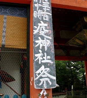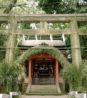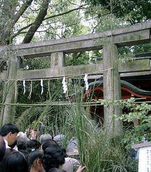 七月三十一日に行われる疫神社祭。 一ヶ月にわたる祇園祭を終えたことを奉告し、 一年のけがれを祓い、無病息災を祈願します。 神事の後、茅を一本持ち帰り、茅の輪にして 御守りにするのが習わしとなっています。