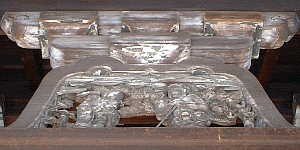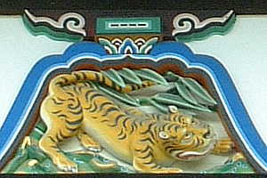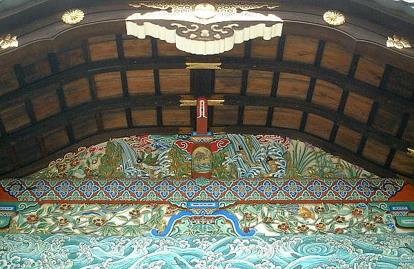 表門からつながる拝殿の写真です。 中央上部の極彩色の模様が目を引きます。