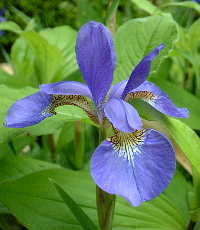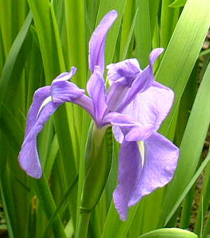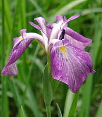 ”何れ菖蒲か杜若” 何れも美しくて菖蒲(あやめ)やら杜若(かきつばた)やら判らぬ、 甲乙つけがたい、と云った意味の諺ですが、実際に見てみると 左からアヤメ、杜若、花菖蒲です。 アヤメは「菖蒲」とも書いて、この字は「しょうぶ」とも読むし、 そして一般に云う「しょうぶ」は本来の菖蒲(サトイモ科)とは 全く別の種類である花菖蒲のことだらかややこしい。 見分け方はアヤメには花弁の弁元に網目状の班紋(虎班模様)があり、 杜若の弁元には白もしくは淡黄色の尖った班紋、花菖蒲には黄色い 目形班紋で、まず見分けられます。 |