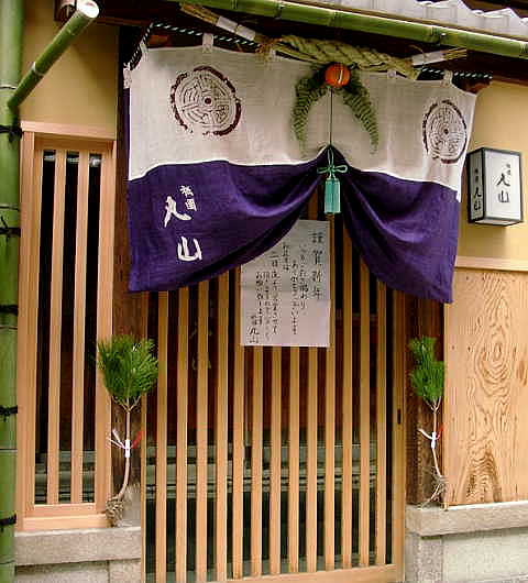 京都旧家の門松はいたって質素です。写真のような飾りが一般的 です。根のついた「根引きの松」を根が付きますようにとの願いから 使います。根の付いた細い若松を白い半紙に巻き、紅白の水引を 結びます。写真は料理屋なので暖簾がありますが、暖簾を除いた 根引きの松と〆飾りが一般的な京都のお正月飾りです。