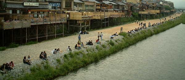 四条大橋より、夕暮れどきの鴨川堤です。 測ったように等間隔で並んでゆきます。 大半はカップル、今も昔も変わらぬ光景です。
