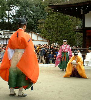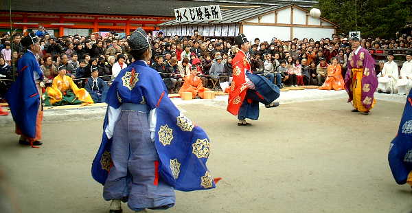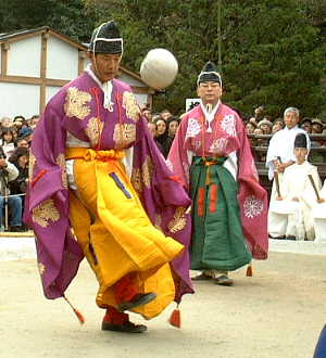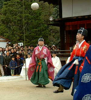 一月四日、下鴨神社で行われた”けまり初め”です。 奈良時代、仏教伝来の頃に伝わったと云われる蹴鞠(けまり)です。 鹿の皮で出来ている鞠を落とさぬように蹴り続ける優雅な遊び。 その極意は相手が蹴りやすい鞠を返すこと、人の立場に立った、 思いやりの精神だとか…