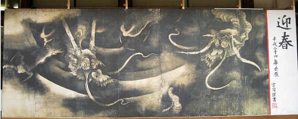 来年の干支は”辰”、 北野天満宮の楼門にも大きな絵馬が掲げられています。 今年は絵馬の他にも絵画の龍が奉納されていました。 この絵画は所蔵する安土桃山時代の絵師、海北友松が 描いた重要文化財の「雲龍図屏風」を基に製作された もので高さ約1.9m、幅約5.1mの大きさ。 今年も受験生にはたのもしい北野天満宮でしょうか。