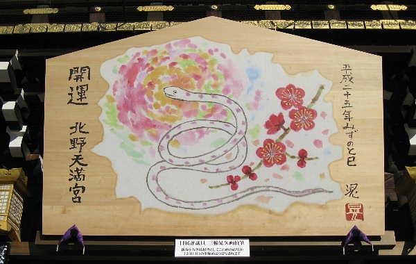 来年の干支は”巳” 毎年恒例、楼門に掲げられた強大な絵馬。