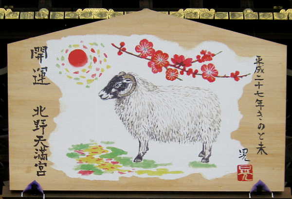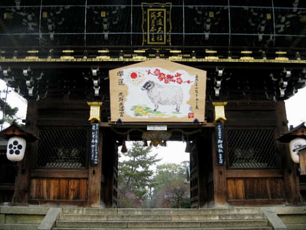 来年の干支は”未” 毎年恒例、楼門に掲げられた強大な絵馬。