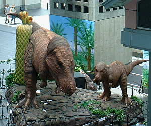 約7000万年前の白亜紀後期、 最後の肉食恐竜として君臨した のがティラノサウルスだそうです。 夏の日帰り旅行キャンペーンの 一環で、JR九頭竜湖駅前に 展示されているのを借用し、 7月10日(土)まで京都駅前に 展示されています。 高さ3.8m、長さ12m、昼間は 15分おきに吠えて動きます。