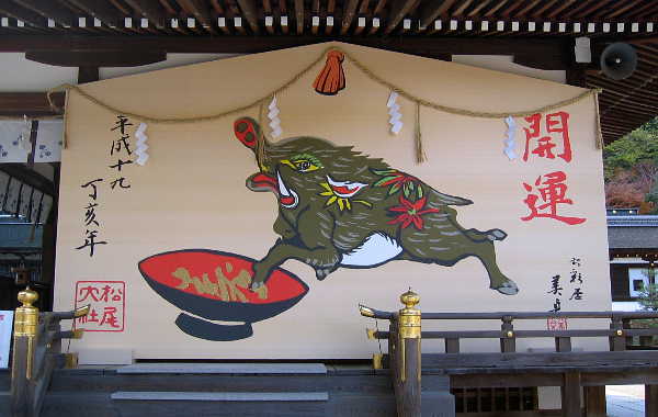 来年の干支は”亥”、 毎年恒例、松尾大社にお目見えした猪のジャンボ絵馬です。 来年は猪突猛進!!