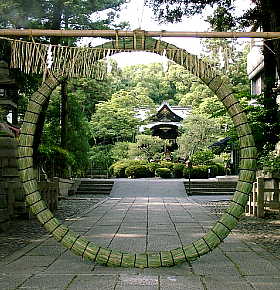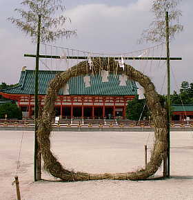 京都では六月三十日は「夏越祓」(なごしのはらえ)の日です。 この半年の罪のけがれを祓い、夏以降の疫病除けを祈願する行事です。 素戔嗚尊(すさのうのみこと)に旅の宿を供して、難儀を救ったと 云われる蘇民将来(そみんしょうらい)が素戔嗚尊の教えに従って 腰に茅の輪を下げたところ、子孫代々に至るまで災いなく栄えたと云う 故事にちなみ茅の輪をくぐる神事が伝わります。 この時期の京都の神社ではよく見かける光景です。茅の輪をくぐるのにも 作法があったりします。また厄よけとして和菓子の水無月を食べる風習も あります。 |