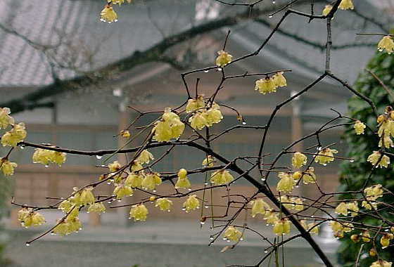 一月の終わりから二月にかけて咲く蝋梅(ろうばい)です。 まだまだ、雨は冷たいですが、梅咲く前ぶれのような蝋梅です。