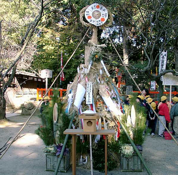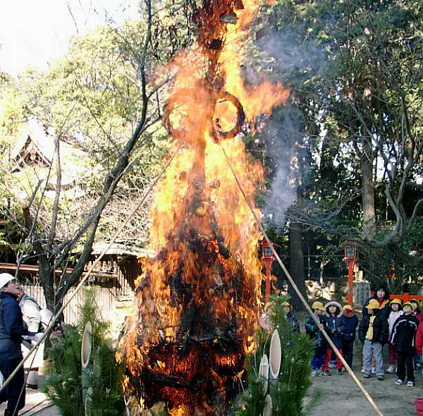 一月十五日に行われることが多い左義長です。 京都では”とんど”と云われます。 竹組に注連縄を掛け中にお正月飾りや書き初めなどを 積み上げて炊きあげることで無病息災を祈る行事。 この火で焼いた餅を食べると病気にならないとか、 火の手が高く上がると書道が上達するとかの 言い伝えがあります。 写真は今熊野神社の左義長行事。