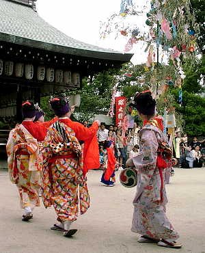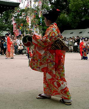 7月7日、そう七夕です。 白峯神宮では七夕祭が行われます。正しくは精大明神例祭と云うらしい ですが、地元では七夕祭とも云われます。 精大明神は蹴鞠(けまり)の飛鳥井家の祖先です。 この例祭でも、まずは祭礼儀式が執り行われ、続いて蹴鞠の奉納、 その後、元禄時代風の衣装で13名の少女が小町踊(織姫舞)を奉納します。 順序は逆になっていますが、蹴鞠の様子は次のページで紹介しています。