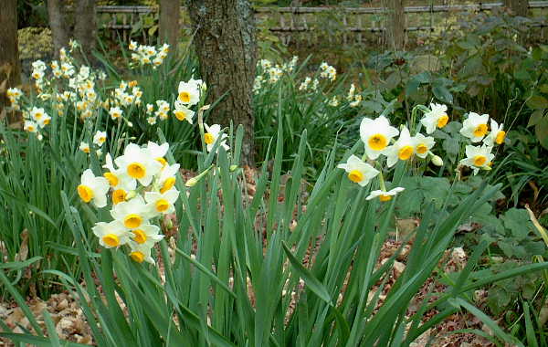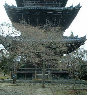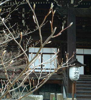 スイセンが咲く真如堂です。 境内は冬景色ですが、新芽を見ることもできます。