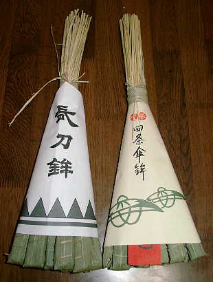 写真は長刀鉾と四条傘鉾のちまき ですが、それぞれの山や鉾で授与 されるのがこのちまきです。 ちまきと云ってもお餅などが入って いる訳ではなく、厄除けとして授与 されます。 京都の民家の玄関先にはこのちまきが 提げられているのをよく見かけます。