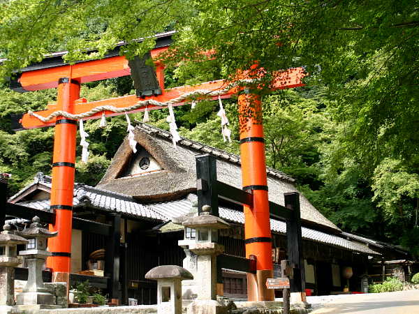 嵯峨鳥居本伝統的建物群保存地区の最も奥になる 愛宕(あたご)神社の一の鳥居です。 少し歩くと愛宕念仏寺がありますが、こちらは ”おたぎ”と読みます。愛宕神社は清滝を超えて 愛宕山(924m)の山頂近くにあります。 写真後ろの建物は鮎の茶屋として知られる平野屋、 秋も深まれば真っ赤なモミジが彩ります。