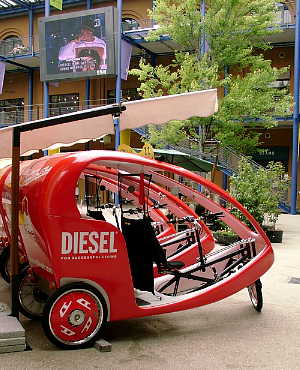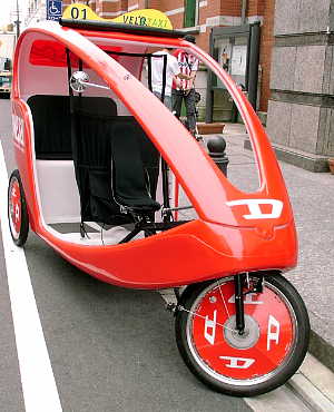 京都で運行が始まったVELOTAXI、自転車タクシーです。 御池通、烏丸通、四条通、寺町通で囲まれた地域だけの 運行です。NPO法人、いわゆる特定非営利活動法人が主体と なってるので、移動手段と云うよりは、環境に対する啓発の 意味合いが大きいのかと考えてしまいます。 同じように自転車タクシーを運行するドイツのベロタクシーを モデルにしているそうです。 自転車は二人乗り禁止だけれど、今回、規則を改正し特別に 認められたようです。一乗車300円です。