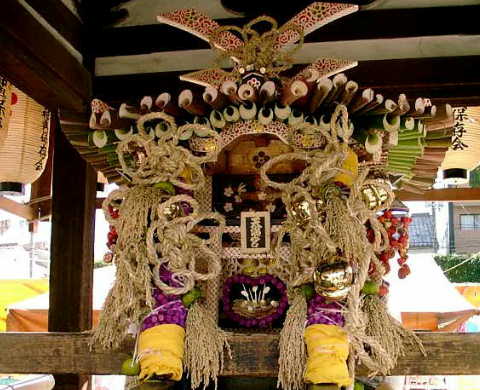 ずいき、五穀、野菜、乾物、海苔、湯葉、麩など数々の食材で 作られている「ずいき御輿」です。北野天満宮で行われる秋の祭、 ずいき祭で氏子地域を巡行します。